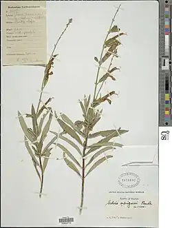 S. orbignaei grows .5 to 1 metre (1.6 to 3.3 ft) high, with subsessile leaves that are 2 to 9 cm (0.79 to 3.54 in) by .8 to 1.3 cm (0.31 to 0.51 in). The inflorescence of lax terminal racemes grows 5 to 20 cm (2.0 to 7.9 in) long, with mostly 2–4-flowered verticillasters and a pinkish-purple corolla that is 3.5 to 4.5 cm (1.4 to 1.8 in) long.[1]