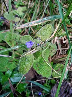 Salvia palifolia is a decumbent perennial herb native to Colombia and western Venezuela, growing in grassland, cloud forest clearings, streamsides, and rocky outcrops from 1,600 to 3,500 m (5,200 to 11,500 ft) elevation. The 3 to 4 cm (1.2 to 1.6 in) long green leaves are hastate or cordate; the blue flowers are 5 to 6 mm (0.20 to 0.24 in) long.[1]