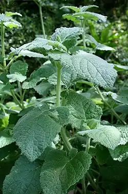 Salvia przewalskii forms a basal clump of yellow-green leaves 1 to 2 feet (30 to 61 cm) high and wide, with flowering stalks rising 3 feet (91.4 cm) above the plant. The 6-12 inch (15 to 30 cm) leaves, with long petioles, have distinct veins on the underside. The inflorescence is branched, with widely spaced whorls of flowers opening a few at once. The 1 inch (2.54 cm) flowers are fat, with an unusual purple-red or red-brown color. The calyx is hairy and glandular, red-brown and two-lipped. It is usually seen only in botanical gardens, though seeds have become available for gardeners since the 1980s.[1] Botanists have segregated the species into four varieties, distinguished by leaf shape and differences in the hairs covering the foliage.