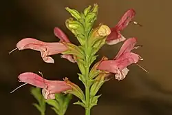 Salvia thermarum is an erect plant that grows up to 1 m (3.3 ft) high from a stoloniferous base. The dark green stems have glandular hairs when young, getting smooth with age. The leaves are dark green with purplish tips, reaching 20 to 35 mm (0.79 to 1.38 in) long by 15 mm (0.59 in) wide. The 40 to 55 mm (1.6 to 2.2 in) long pale red to deep salmon flowers grow in whorls and have red bracts. The plant is easily confused with the closely related Salvia granitica.[1]