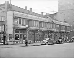 Chang hired architects Kennerly Bryan and William C. F. Gillam, eponymous partners of the Bryan & Gillam firm, to design a building for his narrow lot.[3][12][18] On March 27, 1913, a building permit was issued for a building "6.19 feet in width, 96.04 feet in length".[19] The Sam Kee Building was completed later that year and reportedly cost CA$8,000.[20] For half a century, the Sam Kee Building saw mixed commercial-residential use. Retail shops were located on the ground floor, while the upper floor housed units for residential and organizational use.[3] The basement contained public baths.[21]