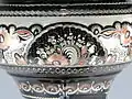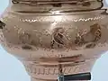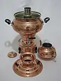 Kashmiri samovars are made of copper, sometimes with engraved or embossed calligraphic motifs. In fact in Kashmir, there were two variants of samovar. The copper samovar was used by Muslims and that of brass was used by local Hindus called Kashmiri Pandit. The brass samovars were nickel-plated inside.[13] Inside a samovar there is a fire-container in which charcoal and live coals are placed. Around the fire-container there is a space for water to boil. Green tea leaves, salt, cardamom, and cinnamon are put into the water.[14]