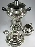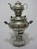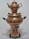 A samovar (Russian: самовар, IPA: [səmɐˈvar] ⓘ, lit. 'self-brewer') is a metal container traditionally used to heat and boil water. Although originating in Russia, the samovar is well known outside of Russia and has spread through Russian culture to other parts of Eastern Europe, as well as Western and Central and South Asia. Since the heated water is typically used to make tea, many samovars have a ring-shaped attachment (Russian: конфорка, konforka) around the chimney to hold and heat a teapot filled with tea concentrate.[1] Though traditionally heated with coal or kindling, many newer samovars use electricity to heat water in a manner similar to an electric water boiler.