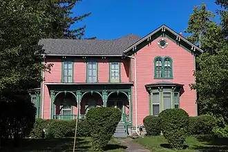 The Tomlinson House is a two-story, L-shaped Italianate wood-framed house clad in clapboard on a stone foundation. It is similar in size and massing as the nearby John and Rosetta Lee House. The front facade has a first floor bay window and paired and rounded-arch windows on the second floor, along with paired brackets along the roofline. A front porch is supported by chamfered wooden posts with arches.[2]