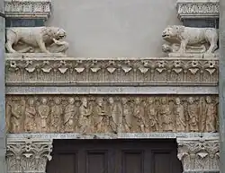 The church gained its present appearance at the time of Buono in 1159, rebuilt in the Pistoiese Romanesque style. Characteristic of this style is the façade, divided into five compartments with arches supported by slender columns, and with a marble bichrome decoration. The portal in the facade is graced with notable Romanesque sculptures; the architrave has a row of standing individuals in togas, depicting "Jesus with the Twelve Apostles" (dated to 1167). Above are two male lions, one atop a guarding a recumbent man, the other atop a bird. Above the portal is a Latin script.