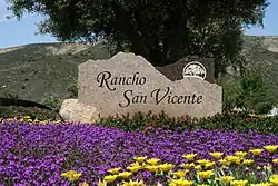 In the 1700s the valley in which San Diego Country Estates is located received its name when Father Mariner of Mission San Diego de Alcalá discovered the location, proclaiming it a constant and beautiful valley, and named it in honor of Saint Vincent.[3] As the area became colonized by the Spanish and later fell under Mexican jurisdiction, the land of the San Vicente Valley became a part of the Mexican land-grant known as Rancho Cañada de San Vicente y Mesa del Padre Barona in 1846. Under the grant prominent persons such as William Augustus Barnett and families, the Dukes, settled the region.[4]