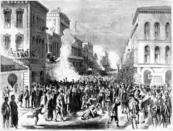 Harper's Weekly covered the 1871 celebration from a Caucasian perspective: "Our illustrations on page 260 will give the reader a vivid idea of the way in which the Chinese keep their New-Year's Day in San Francisco. Their year commences on the 18th of February, but the festivities continue for several days, to the great annoyance of the people, as the principal diversion is the constant explosion of fire-crackers and bombs."[10] The San Francisco Call noted the holiday in an 1892 article, writing that "no nation [celebrates] the New Year ... with greater rejoicing and feasting than the Chinese", adding that "[m]any white residents who at other times united in saying 'the Chinese must go' find it convenient to invade Chinatown during the holidays and freely partake of Celestial hospitality. Some go further than this and try to carry off everything that is not nailed down."[11]
