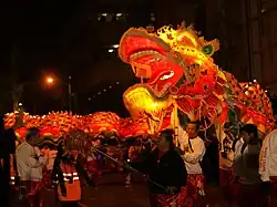 The parade is the climactic event, held at the close of festivities.[119] Private celebrations of Chinese New Year began in 1851, and the first dragon was paraded in 1860.[120] Scenes from the 1961 parade were used in the film Flower Drum Song.[121] By 1974, a crowd estimated at 420,000 people watched the parade.[122]