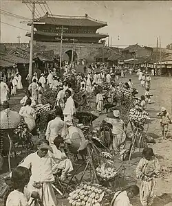 In a 12th century Song dynasty record called Koryŏ togyŏng, it is reported that the citizens of Goryeo, from the king down to the common people, wore hats that were typically worn over topknots.[1] In 1278, by order of King Chungnyeol, officials wore a Mongolian-style queue haircuts tied at the back of the head, leaving only the hair on the top of the head. However, under King Gongmin, topknots were again worn, and during the Joseon Dynasty, the use of topknots can be seen in both portraits and genre paintings.[1]