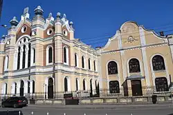 The presence of Jews in Transylvania is first mentioned in the late 16th century. In the 17th century, prince Gabriel Bethlen permitted Sephardi Jews from Turkey to settle in the Transylvanian capital Gyulafehérvár (Alba Iulia), in 1623.[16] In the early 18th century, Jews were allowed to settle in Sathmar. Some of them became involved in large-scale agriculture, becoming landlords or lessees, or were active in trade and industry,[17] or distilled brandy and leased taverns on crown estates. In 1715, when Sathmar became a royal town, they were expelled, beginning to resettle in the 1820s.[18] In 1841, several Jews obtained the permission to settle permanently in Sathmar; the first Jewish community was formally established in 1849, and in 1857, a synagogue was built. After a great number of traditional Ashkenazic Jews had settled in the town, the Jewish community split in 1898, when a supporter of the Hasidic movement was elected chief rabbi, into an Orthodox and a Status Quo community, led by a Zionist rabbi, which erected a synagogue in 1904.[17]