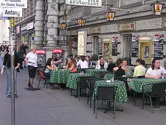 Schanigarten (plural: Schanigärten) is the Austro-Bavarian term for tables and chairs set up on the sidewalk in front of eating and drinking places. Unlike normal beer gardens (Gastgärten), the customers actually sit on public property. Originally, Schanigärten referred only to Viennese coffee houses, but now the expression is used in other parts of Austria and for other types of establishments like restaurants and taverns.