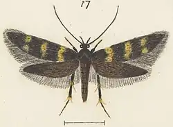 9-10 mm. Head, antennae, and thorax dark bronzy-fuscous. Palpi rather dark fuscous, internally whitish-ochreous, terminal joint as long as second. Abdomen dark fuscous, apex whitish-ochreous. Fore-wings elongate, narrow, costa gently arched, apex round-pointed, termen very obliquely rounded; fuscous, slightly purplish-tinged, irrorated with dark fuscous and blackish; a straight rather narrow fascia at 1⁄4, a small spot in middle of disc, and opposite subcostal and subdorsal spots at 3⁄4 pale ochreous-yellow, irregular-edged : cilia fuscous, mixed with dark fuscous towards base. Hind-wings dark fuscous; cilia fuscous, with dark fuscous basal shade.[4]