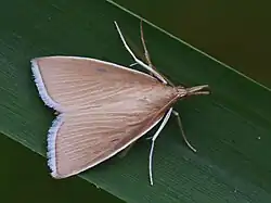 In Great Britain, the first three records (1988 to 1995) were thought to be migrants, but subsequent records from a garden near Exeter, close to a newly-thatched cottage are believed to have originated from reeds imported from central Europe. A colony was discovered, in 2010, on the Isle of Wight at Afton Marsh and has been recorded annually since. The origin of the Isle of Wight moths in unknown and migration would seem the more likely.[2][4]