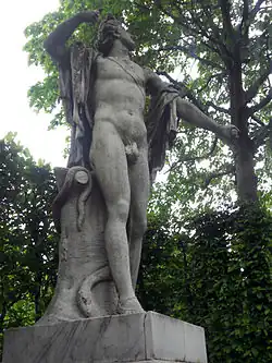 | 31 | Amphion | Joseph Baptist Hagenauer | Amphion was the son of Zeus by Antiope.[38] After she was raped by Zeus, Antiope fled to Sicyon and married King Epopeus. She was later captured by Nycteus or Lycus and taken back to Thebes. Along the way she gave birth to the twins and was forced to leave them on Mount Cithaeron. After being enslaved by Lycus and his wife Dirce, who treated her cruelly for many years, Antiope escaped and eventually found her sons, who avenged her captivity by killing Dirce—tying her to the horns of a bull.[39] Amphion and Zethus went on to conquer Thebes, where they ruled together. Amphion became a great singer and musician after Hermes taught him to play and gave him a golden lyre. He and his brother built the walls around the Cadmea, the citadel of Thebes. Amphion's musical skill was so great that when played his lyre, the stones simply moved into place.[39] | |
