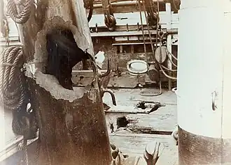 A 300-pound shell from the Huáscar hit the Abtao, destroying the bridge and wounding Carlos Krugg who second in command of the ship. In addition, 5 men died and another 6 were wounded. Another shell made an impact, exploding on deck and entering the bunkers, killing an additional 5 men and wounding 5 more.