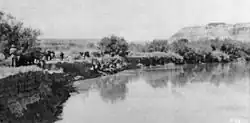 The Imperial Camel Corps Brigade was stopped 1 mile (1.6 km) north-west of Umm esh Shert when confronted by strong opposition west of the river which may have included the Cossack posts dislodged by the light horse advance which had fallen back to Mafid Jozele 4.5 miles (7.2 km) north of Umm esh Shert and the garrison from Red Hill (about halfway between Umm esh Shert and Mafid Jozele) which had been forced off by the 1st Light Horse Regiment (1st Light Horse Brigade).[39][91][92]