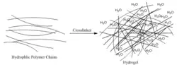 Crosslinking is the process of joining two or more polymer chains. Both chemical and physical crosslinking exists. In addition, both natural polymers such as proteins or synthetic polymers with a high affinity for water may be used as starting materials when selecting a hydrogel.[1] Different crosslinking methods can be implemented for the design of a hydrogel. By definition, a crosslinked polymer gel is a macromolecule that solvent will not dissolve. Due to the polymeric domains created by crosslinking in the gel microstructure, hydrogels are not homogenous within the selected solvent system. The following sections summarize the chemical and physical methods by which hydrogels are crosslinked.[1]