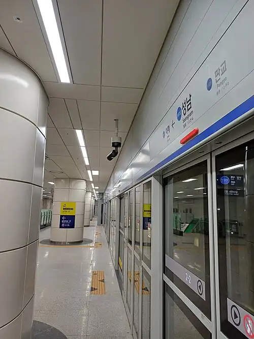 Seongnam Station (Korean성남역; Hanja城南驛) is a railway station on GTX-A and Gyeonggang Line of the Seoul Metropolitan Subway.[1] It is located at Baekhyeon-dong, Bundang, Seongnam, Gyeonggi, South Korea.