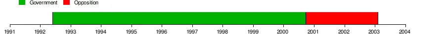 After the announcement that SPS would abandon its hardline position regarding the Bosnian War and Croatian War of Independence in favour of a compromise and after a dispute regarding the rebalancing of the federal budget in July 1993, the coalition between SPS and SRS was disintegrated.[17]: 100 SRS then unsuccessfully called a motion of no confidence against SPS in September 1993, though Milošević ended up dissolving the National Assembly to call a snap parliamentary election for December 1993.[17]: 102 [29] In the parliamentary election, SPS won 123 seats, though still short 3 seats of a majority, Milošević then persuaded the New Democracy (ND), which as part of the SPO-led Democratic Movement of Serbia coalition won 5 seats, to enter a coalition government with SPS.[29][30] ND accepted this and the new government headed by Mirko Marjanović was sworn in March 1994.[29][30]