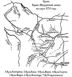 - ^ a b c d Стеценко, Н.К. "О причинах строительства и функциях Азово-Моздокской линии" [On the reasons for the construction and functions of the Azov-Mozdok line]. russiancity.ru (in Russian). Archived from the original on 2024-11-14. Retrieved 2024-11-13.