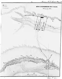 As the Kabardians approached in range, Russians suddenly opened heavy fire.[23][27] The Kabardians continued to advance to the front despite the intense fire, concentrating their attack on the center, where General Yakobi was located.[44][71] The Russian infantry managed to broke up the Kabardian charge with volley fire.[71] After that, they charged the Cossacks on the right flank of the Russian army, engaging in intense combat for 2 hours.[7] Some of the Kabardians tried to slip behind the Russian army, but they were met with heavy fire.[44]