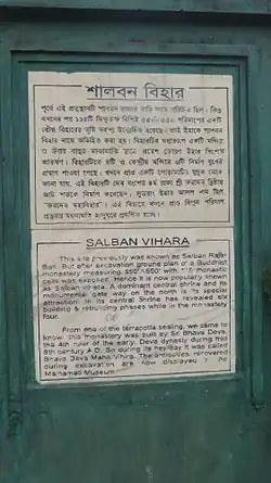 The Vihara was founded in the eighth century by Bhava Deva, the fourth ruler of the Early-Deva dynasty. The 168 square meters site was built in or on the outskirts of Devaparvata, the Samatata capital bordering the Lalambi forest.[4] The site was, previously known as Shalban Rajar Bari or King's residence at Shalban, was renamed Shalban vihara after archeological excavation revealed terracotta seals and copper plates identifying it as the remains of a residential Buddhist monastery.