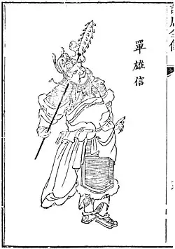 Shan Xiongxin is one of the most important figures in folk tales about the Sui and Tang dynasties. In the legend, Xiongxin was said to be his courtesy name while his given name was Shan Tong. He was one of the top-tier warriors at that time and was known for his bravery and generous. His weapon was a lance with golden nails. He had an elder brother named Shan Xiongzhong, who was accidentally killed by Li Yuan, who later became the founding emperor of the Tang dynasty. Shan brothers were said to be gang heads in Hebei area with good reputations on helping poor people and punish bad officials. When Qin Shubao was in trouble, Shan Xiongxin tried his best to help Qin. Later, both Shan and Qin joined Wagang Army. After the Wagang failed, Qin Shubao submitted to the Tang dynasty. However, because the Tang emperor killed his brother, Shan refused to do so. He became a son-in-law of Wang Shichong. After battles at Luoyang, Shan Xiongxin was captured by Li Shimin. Li Shimin apologized his father's fault to Shan Xiongxin, hoping Shan would submit to Tang. However, Shan still refused to surrender. Li Shimin had to execute him.