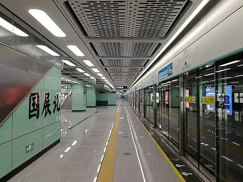 Shenzhen World North (simplified Chinese: 国展北站; traditional Chinese: 國展北; pinyin: Guózhǎn Běi Zhàn; Jyutping: Gwok3 Zin2 Bak1) station is an interchange station for Line 12 and Line 20 of Shenzhen Metro in Shenzhen, Guangdong, China. Line 20 platforms opened on 28 December 2021 and Line 12 platforms opened on 28 November 2022.[1][2] It is located in Bao'an District.