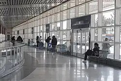 The station was designed by Adamson Associates Architects (above grade buildings and mezzanine) and The Stevens Group Architects (below grade).[15] The subway platform lacks pillars and the ceiling is high and curved, evoking an aircraft hangar. High ceilings, skylights and an exceptionally large mezzanine make the station feel open and airy. Natural light reaches all areas of the station including the subway platform. The offset, glassed-in access walkway above the platform overlooks it and gives passengers views of passing trains below. Originally, the walkway was divided by a sinuous barrier as it ran through both the fare-paid and unpaid areas, with the unpaid half leading from an entrance at the north end of the station to the main fare concourse. The barrier was removed after this entrance had Presto card paddle fare gates installed in 2017. As a result, the north side entrance to the station is now a fully automated entrance and is only accessible to those using Presto.[16]