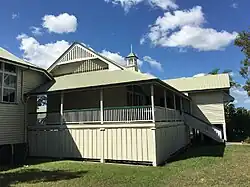 A new 45-by-18-foot (13.7 m × 5.5 m) school room, designed to accommodate 120 children, and a teacher's residence were built for the opening of the West Oxley National School, which occupied a three-acre (1.2ha) site on the corner of what are now known as Oxley and Sherwood Roads.[13][14][15] The picturesque buildings, designed by architect Richard Suter, were sited in the southwest corner of the grounds, with a steep slope to the east leading down to a watercourse just outside the boundary.[16] As was required for the establishment of a national school, approximately one third of the £328 building cost was raised by the local community.[5][17] Attendance in the first year was reportedly 64 children.[18] [1]