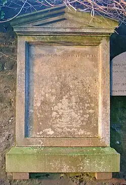 David Boyle was born in 1772, was twice married and was M.P. for Ayrshire in 1793, Lord Justice-General of Scotland and Lord President of the Court Session in 1841.[12] He died on 4 February 1853 and was buried at Shewalton, however a memorial to him resides at the family burial plot in Dundonald Church (See photograph).[12] In 1865 a statue of Boyle was erected in Irvine and now stands in Castle Street after being moved from the east end of the town's High Street.[4][13] He had adopted the designation 'of Shewalton', having formerly held the designation 'of Marress'.[12] David was the presiding judge and sentenced the murderers Burke and Hare. He was said to have had "some of the greatest judicial imperfections and some of the greatest judicial excellencies, to be of untiring industry, perfect candour, and held the principles of a gentleman, and a very sensitive conscience, with a heart resolute in honesty."[14]