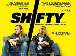 Shifty is a 2008 British urban crime thriller film, written and directed by Eran Creevy. Set on the outskirts of London and filmed in Borehamwood, Shifty explores themes of friendship and loyalty over the course of 24 hours in the life of a young drug dealer named Shifty. The majority of the film was shot in Borehamwood, Hertfordshire, which is home to Elstree Studios. Based on Eran Creevy's own teenage experiences, the film features compelling performances from a cast of emerging talents, as well as veteran actors Jason Flemyng and Francesca Annis. Shifty was funded by Film London's Microwave scheme[2] and completed within a shooting schedule of just 18 days.[3]