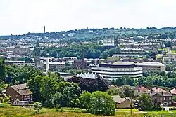 Of more concern in the immediate post-war period was the deteriorating housing stock. In the 1950s, the back-to-backs of Hargreaves Square were condemned as slums and the site redeveloped. The redevelopment removed several historic buildings – Shipley Old Hall (1593), at the junction of Kirkgate and Manor Lane[25] and of which a few fragments of roof drainage and a roof truss survive in Crowgill Park (formerly Crowghyll Park),[26] Shipley Hall (1734), which stood at the junction of Market Street and Otley Road became the headquarters of Windhill Cooperative Society[25] and possibly Hudson Fold House (1629).[27] Of the major Victorian town centre buildings, only the Old Bradford Bank (now Barclays) and Sun Hotel remain.[28] The slums were replaced with low-rise modern retail outlets, a central square serves as an outdoor market and an underground indoor market is situated beneath a tall, brutalist market hall tower which is a visible landmark for many miles around. Until recently the tower had a 'man' striking a bell to mark the hours.[29]