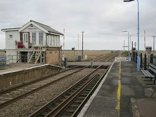 Simon Usborne of The Guardian wrote, "It's hard to imagine a more desolate place to get off a train. Shipping containers for sale stand in a muddy yard behind the far platform, opposite the pitched-roof signal box, now shuttered. Otherwise the view is of field after field, some showing maize stumps, others now peat-black and ploughed."[5]