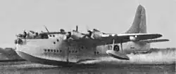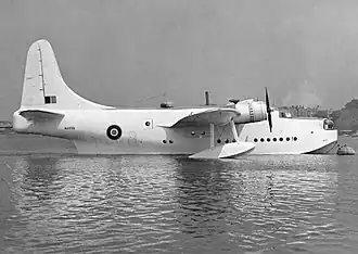 On 30 August 1944, the prototype (MZ269) first flew from the River Medway at Rochester. The increased engine power caused aerodynamic stability problems, and a new fin was designed with greater height with forward dorsal extension, plus a new tailplane with increased span and area.[3] Changes were so extensive that the new aircraft was given the name Seaford.[4] Thirty production aircraft were ordered, but the first of these flew in April 1945, well after the introduction of the Sunderland Mark V, and too late to see combat in Europe. The prototypes were powered by Hercules XVII engines of 1,680 hp (1,253 kW), but production aircraft used 1,720 hp (1,283 kW) Hercules XIX engines. The planned Glenn Martin tail turrets were never installed. Eight production Seafords were completed; the first (NJ200) was used for trials at MAEE Felixstowe. The second production Seaford (NJ201) was evaluated by RAF Transport Command, then in December 1945 it was loaned without armament to BOAC as G-AGWU, then returned to MAEE as NJ201 in February 1946. In April 1946, the other six production Seafords were delivered to No. 201 Squadron RAF for brief operational trials. In 1948, those six aircraft were modified as civilian airliners at Belfast, then leased to BOAC with the designation Solent 3.[5]