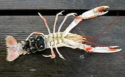 Removing the "sand vein" (a euphemism for the digestive tract) is referred to as "deveining". This can be removed by making a shallow cut lengthwise down the outer curve of the prawn's body, allowing the dark ribbon-like gut to be removed with a pointed utensil. Special deveining tools are sometimes used, but knives, skewers, and even toothpicks can be used to devein.[13][14] Alternatively, if the tail has been detached, the gut can be pinched at the tail end and pulled out completely with the fingers. On large prawns, the "blood vein" (a euphemism for the ventral nerve cord) along the inner curve of its body is typically removed as well. It is then rinsed under cold running water. Removing these "veins" is not essential, as it is not poisonous and is mostly tasteless.[15] Deveining does slightly change the flavor and makes it more consistent.[16] Shrimp also sometimes consume small amounts of sand and so the vein might be gritty.