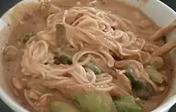 | Dandan noodles | ![]() | 擔擔麵 | 担担面 | dàndàn miàn | Originally a Chengdu street snack sold by men with "carrying poles" (dan).[24] |