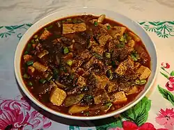 | Mapo tofu | 麻婆豆腐 | 麻婆豆腐 | mápó dòufǔ | Literally "pockmarked old woman's tofu". Spicy sauce similar to yuxiang ("in the style of fish") sauce.[25] | |