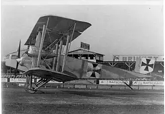 The Forssman was a large, four-engined, three-bay biplane with an extensively glazed, fully enclosed cabin.[7] The wings were unstaggered and of uneven span,[11] and the undercarriage consisted of two mainwheels carried on a common axle, plus a tailskid.[11] The tail was of conventional layout with a single fin.[7] Power was supplied by 110 hp (82 kW) Mercedes D.III engines mounted on short struts on the lower mainplane.[1][7] The design bore such a strong resemblance to the contemporary Sikorsky Ilya Muromets bombers produced in Russia that Jane's Encyclopedia of Aviation describes it as "virtually a copy" of that aircraft,[6] and in their book on German multi-engine types of World War I, Haddow and Grosz comment that designer Villehad Forssman "was content to copy the Sikorsky configuration almost line-for-line".[12]