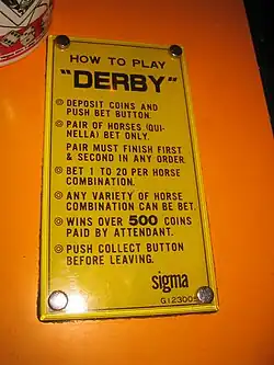 Sigma Derby is an electro-mechanical horse race used for gambling manufactured by Japanese manufacturer Sigma Game Inc. and introduced in 1985.[1] Up to ten players can buy in with quarters and place bets on the five horses; a quinella of two horses in any order pays out according to the odds. The house has roughly a 10-20% advantage, depending on the machine.[2]