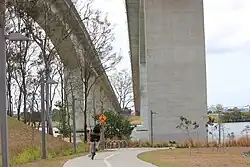 The Wynnum Road upgrade was completed on 13 July 2007 and 2 additional southbound lanes between the Port of Brisbane Motorway and Wynnum Road completed in late 2007. Four of six lanes of the new Gateway Motorway deviation were opened in July 2009. All works south of the river were complete by the end of 2009 after 10 years of constant roadwork and traffic disruption. The final concrete pour linking the sides of the new bridge was made in late October 2009.[13] A total of 748 concrete segments, which are supported by 17 piers, were placed for the new bridge.[20]
