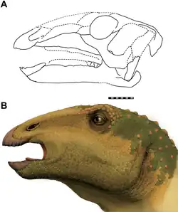 Described in 2015 by Thai palaeontologists Masateru Shibata, Pratueng Jintasakul, Yoichi Azuma and Hai-Lu You, Sirindhorna was one of eighteen dinosaur taxa from the year to be described in an open access or free-to-read journal.[1][3] It's the third species of iguanodont found in Thailand, following Siamodon and Ratchasimasaurus, both known from poorer material, and the first ornithopod from Southeast Asia to have a well-preserved skull. The type and only species of the genus is Sirindhorna khoratensis. The taxon is known from the holotype specimen NRRU3001-166, an articulated braincase, as well as a number of disarticulated referred specimens. The material known from these referred specimens consists of three more partial braincases, one with an articulated postorbital, one right premaxilla, a left and right maxilla, a right jugal, surangular, and quadrate, one predentary, a right and left dentary, and assorted teeth. The generic name is dedication to Princess Maha Chakri Sirindhorn for her contribution to the support and encouragement of palaeontology in Thailand. The specific name is derived from Khorat, the informal name of Nakhon Ratchasima Province.[1]