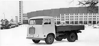 The new model was developed under supervision of Nils Fagerstedt[5] and Senior Engineer Pentti E. Lehtinen. The objective was to design the lorry as light as possible with the biggest possible load capacity. The tyre size selected was 7.50-16", which allowed 1 000 kg load per unit and also a low platform height, and therefore limited the total weight to 6 tonnes. The wheelbase was 2 500 mm and the outer dimensions were small, making the lorry agile. A forward-control cabin enabled a 3 450 mm platform length. In order to reduce weight, the frame was joined together completely by welding, instead of riveting, which had been the case in every previous Sisu model. The steel used had almost 50% better tensile strength than the materials used by then. By these actions a weight saving of over 100 kg was reached.[2]