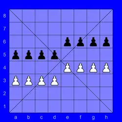 - Second stage: in each move, each player moves any one of their pieces (not a pawn) to any other empty place in their own half of the board, ignoring the usual move rules. Or they can move a pawn one square forwards and this ends the second stage and the third stage starts.