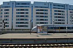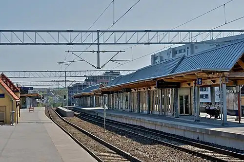 Skøyen Station (Norwegian: Skøyen stasjon) is a railway station located at Skøyen in Oslo, Norway. It is situated on the Drammen Line, 4.36 kilometers (2.71 mi) from Oslo Central Station. It is served by regional trains and the Oslo Commuter Rail, operated by Vy, as well as by the Airport Express Train. The station is elevated and has two island platforms and four tracks.