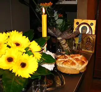 A Slava celebration incorporates aspects of pagan traditions with minimal clerical involvement.[8] The ritual foods that are prepared for the feast are the slavski kolač (or simply kolač), a ritual bread, and koljivo (or žito), a dish of minced boiled wheat, sweetened and sometimes mixed with chopped walnuts.[2][21] A beeswax candle stamped with an image of the saint is also a staple at the celebration.[21]