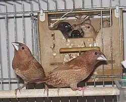These birds like to be close together and tend to all roost in one nest if kept in a group. In an aviary they lay eggs and crowd into a single nest, interfering with incubation (which is performed by the female and lasts 16 days) or damaging the eggs. Thus they breed better if kept as single pairs in individual breeding boxes.[2] This sociability is also responsible for their American name of "society finch."