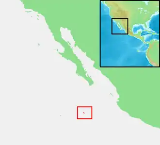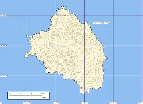Socorro Island (Spanish: Isla Socorro) is a volcanic island in the Revillagigedo Islands, a Mexican possession lying 600 kilometres (370 mi) off the country's western coast. The size is 16.5 by 11.5 km (10.3 by 7.1 mi), with an area of 132 km2 (51 sq mi). It is the largest of the four islands of the Revillagigedo Archipelago.[1] The last eruption was in 1993.