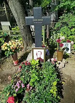 On 20 August 1933, Vedeneyeva returned to Moscow and that same day, she took the train to join Parnok and Tsuberbiller in Karinskoye.[149] The arrival was not due to Parnok's illness, but a scheduled arrival per her pre-planned itinerary.[150] On 25 August, Tsuberbiller realized that Parnok was dying and notified Erarskaya.[151] Parnok succumbed to a heart attack at 11:30 a.m. on the morning of 26 August 1933 with Tsuberbiller and Vedeneyeva at her bedside. Though she tried to make the trip from Moscow before Parnok died, Erarskaya did not arrive until around 5 p.m.[152][150] A portrait of Tsvetaeva was on her bedside table when she died.[153] The village druggist assisted Tsuberbiller in obtaining the necessary paperwork to take the body back to Moscow, after the funeral service in Karinskoye. Her funeral procession on 28 August with her friends and fans extended 75 kilometers outside of Moscow. They did not reach the city until the following day.[154][150] She was buried in Vvedenskoye Cemetery in Olga Tsuberbiller's family plot.[150][155]