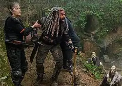In the nearby outpost, Carol surprises the Saviors moving the machine guns, killing several. The remaining Saviors rush to transport the guns away by Humvee, resulting in a firefight outside the building, near where Ezekiel and Jerry are fighting. Carol is able to trick the Saviors into letting their guard down, killing all but two of them, but she then spots Ezekiel and Jerry close to being overrun by walkers. She goes to help them, allowing the Saviors to escape in the Humvee. Rescued, Ezekiel laments that Carol let the guns get away, but they then hear the roar of a nearby motorcycle. Outside the complex, Rick and Daryl show up, giving chase. The two force the Humvee off the road.
